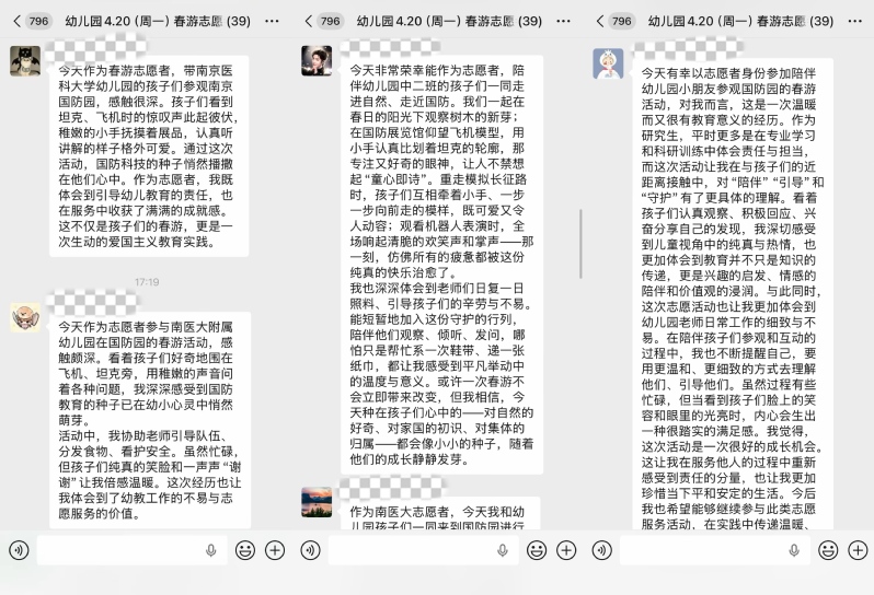 4月20日上午,南京医科大学幼儿园全体小朋友伴着春风走进国防园,开启了一场感受国防风采的春游活动。本次活动得到南京医科大学公共卫生学院志愿者们的全程护航与暖心陪伴,她们细心提醒幼儿注意脚下,不脱离队伍,协助老师清点人数,与老师一起为孩子们筑牢安全防线。志愿者们纷纷表示,很荣幸参与到此次活动中,见证孩子们的天真和勇敢,做他们探索世界路上的一天守护者。